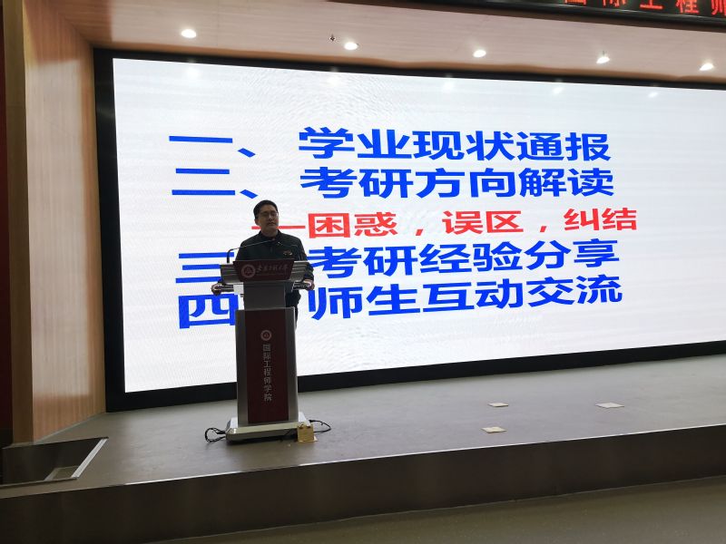 系主任刘玉飞重点通报了机器人工程专业的学业现状,指出在学业成绩、实践创新等方面存在的不足,要求同学们增强荣耀和使命意识,认真审视自己,合理规划学业,强化专业知识学习和实践能力培养,创造充实而精彩的大学生活。随后,他针对同学们在考研过程中存在的困惑、误区和纠结等共性问题,从考研意义、学校专业、报考类别选择等方面做了分析解读。