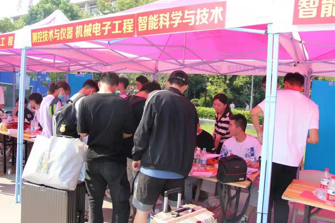 迎新活动现场,帐篷悬挂各专业标签,指引学生前来报到。接过行囊,感“械”有你,增长才“智”,锤炼本领,学院展板文字满怀