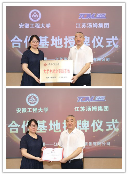 伊长文代表学院与汤姆集团签订了人才培养与就业基地合作建设协议书。李文江代表学院授予江苏汤姆公司大学生就业实践基地铜牌,同时聘请汤建华为欧美av 大学生创新创业教育导师库专家。