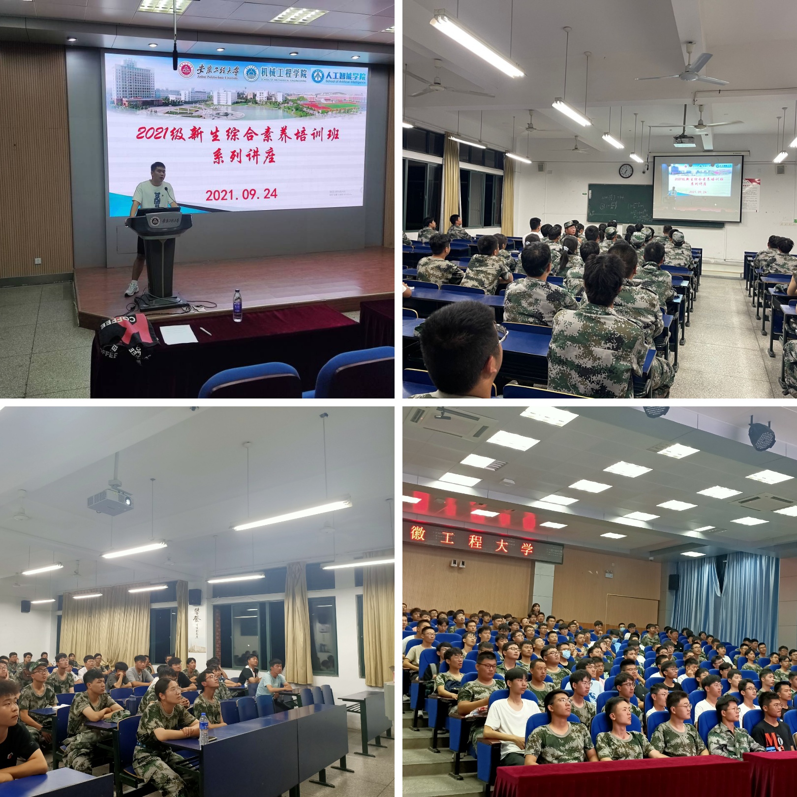 不忘初心与使命,从百年党史中汲取智慧和力量,刘德军则通过“读《论中国共产党历史》悟大学生成才之路”勉励新生学子要加强党史学习,积极继承党的成功经验和优良传统,并以实际行动积极向党组织靠拢。闫石以“礼仪与沟通”为主题,通过诙谐幽默的语言向学生讲解了正确的礼仪与沟通方式知识。郭广春从两个第一次、至少“两个没有”、一个理想与抱负、学习与实践入手与新生学子共话“大学与成长”,勉励新生学子要做最新的安工程人、做最勤的安工程人、做最美的安工程人。周宇航、潘颢及李增产三位优秀学长分别从志愿服务、网络信息素养及网络安全、学习方法掌握及学习习惯培养等方面进行了经验分享,充分发挥了学生先进典型的示范引领作用。