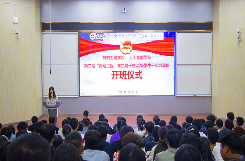为加强对青年大学生的思想政治引领,加强学院入团积极分子培养和学生骨干队伍建设,10月27日晚,机械工程学院(欧美av )第二期“青马工程”学生骨干暨2021级学生干部培训班开班仪式在2教报告厅举行。学院党委书记伊长文、党委副书记何志恒出席开班仪式,学院有关辅导员和培训班全体学员参加。开班仪式由培训班班主任时慕天主持。