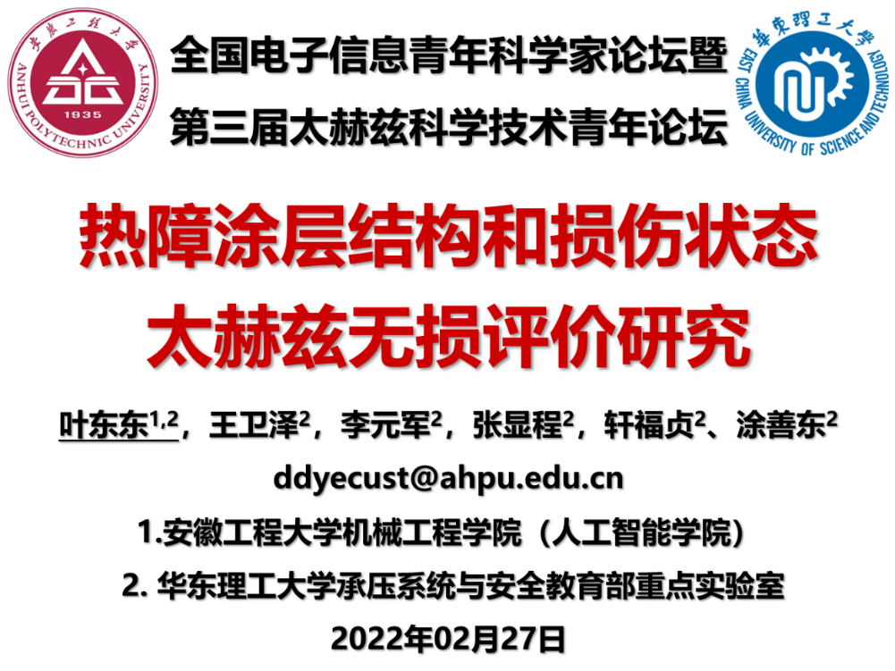 论坛开幕式,中国工程院院士吴伟仁、刘永坚、范国滨,中国电子学会副秘书长张毅和中国电子学会青年科学家俱乐部太赫兹专委会委员、清华大学研究员赵自然为论坛致辞。中国电子学会青年科学家俱乐部太赫兹专委会主任委员、军事科学院常超研究员主持开幕式。欧美av 青年教师叶东东博士受邀通过视频形式参加了此次会议,并在太赫兹雷达及成像技术分会场作题为《热障涂层结构和损伤状态太赫兹无损评价研究》的青年邀请报告。会议期间,叶东东博士与来自上海理工大学、中国矿业大学、清华大学、北京理工大学等领域内专家学者关于太赫兹检测技术的应用方面进行了深入交流和探讨。