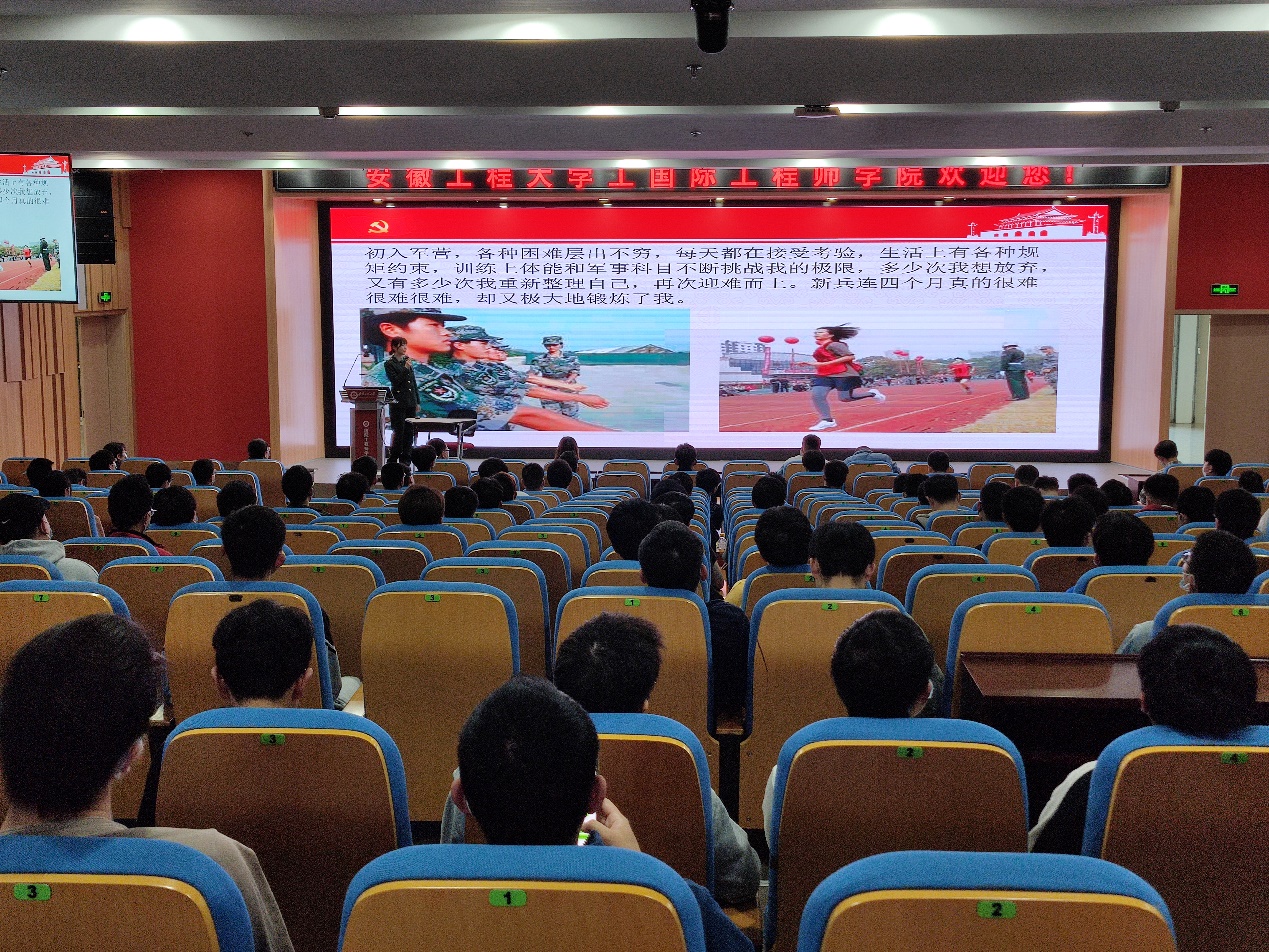韩冰冰结合参军之后的生活、训练、食宿以及退伍之后的复学情况进行了分享交流,激发了同学们的报国之情和爱国之志。