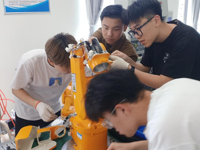 为了做好技能培训工作,遴选具有相关专业背景、实践经验丰富的党员教师作为指导教师,多次研讨培训内容和授课方案,采取线上线下相结合的方式举行开班仪式,分批开展技能培训,确保操作培训安全有序进行。通过机器人拆装与调试、机器人操作与编程、机器人集成应用等实践操作,强化学生的机器人专业知识和应用技能,将思政教育与专业知识教育有机融合,引导学生理解并自觉实践行业职业精神和职业规范,增强职业责任感和终身学习意识。