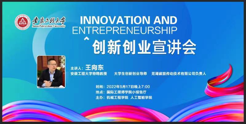 为提升大学生创新创业能力,激发大学生创业意识,丰富大学生的创新创业知识,5月17日晚上,学院特邀芜湖磁轮传动技术有限公司董事长、欧美av 特聘教授王向东开展创新创业主题宣讲会,100余名本科生、本科生指导教师参加宣讲会。报告会由学院党委副书记李文江主持。