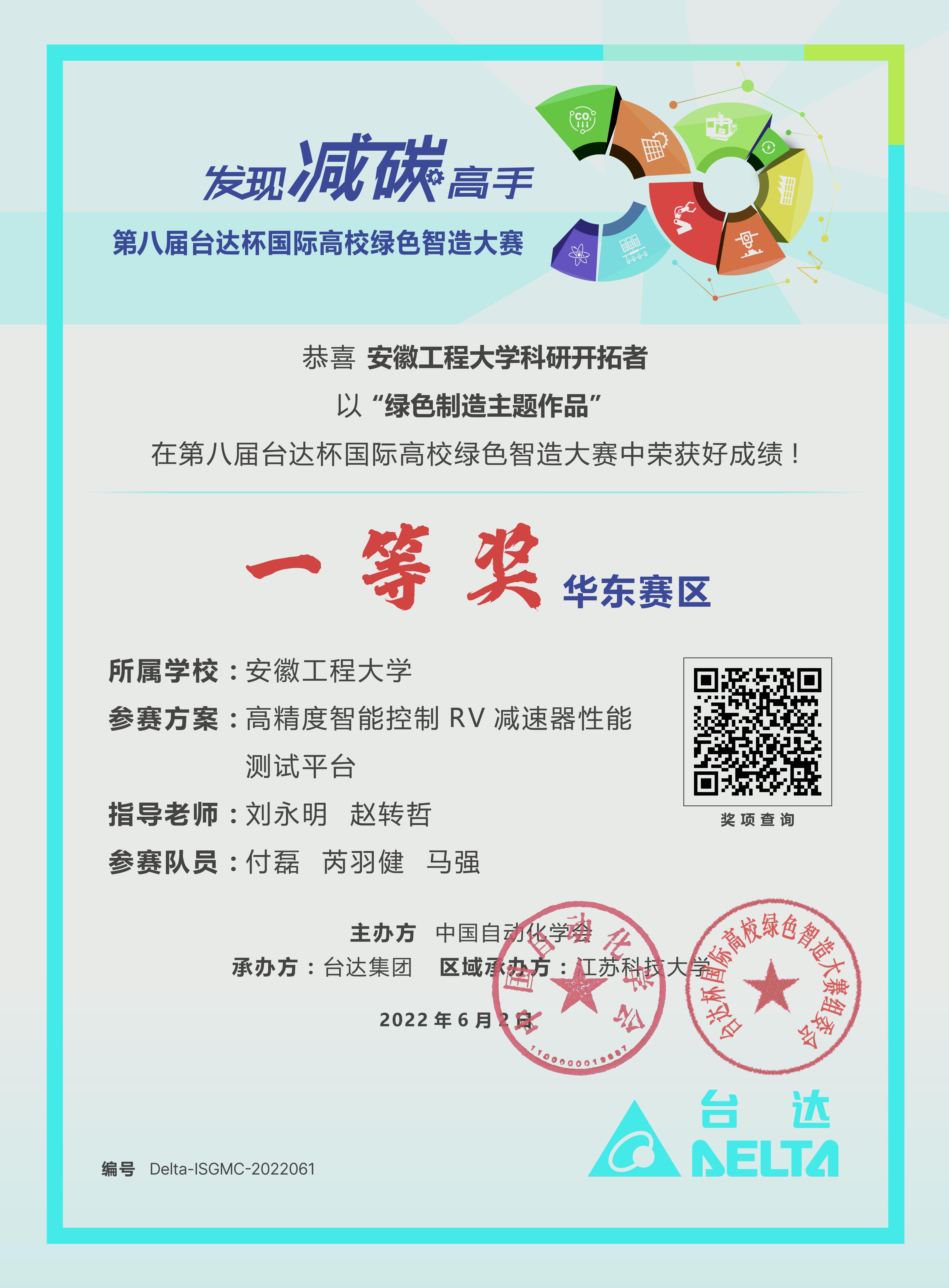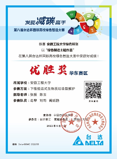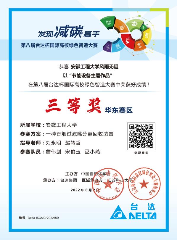 日前,由中国自动化学会主办的第八届台达杯国际高校绿色智造大赛华东赛区在江苏科技大学顺利闭幕,由机械工程学院(欧美av )赵转哲、刘永明、张振、陈玉等教师指导的研究生作品参赛,经过激烈的角逐,4件作品分别获一等奖、二等奖和三等奖以及优胜奖。