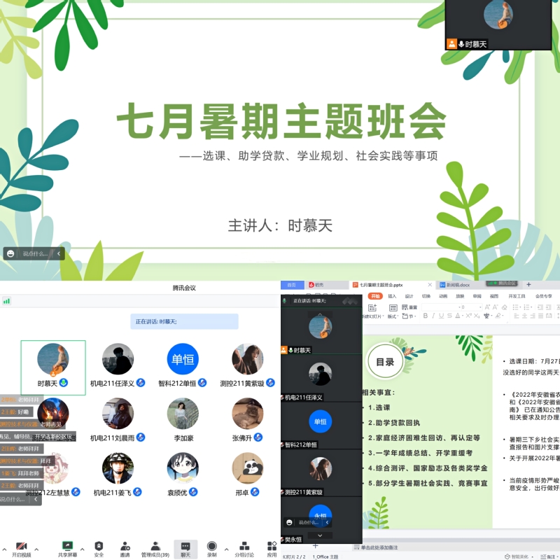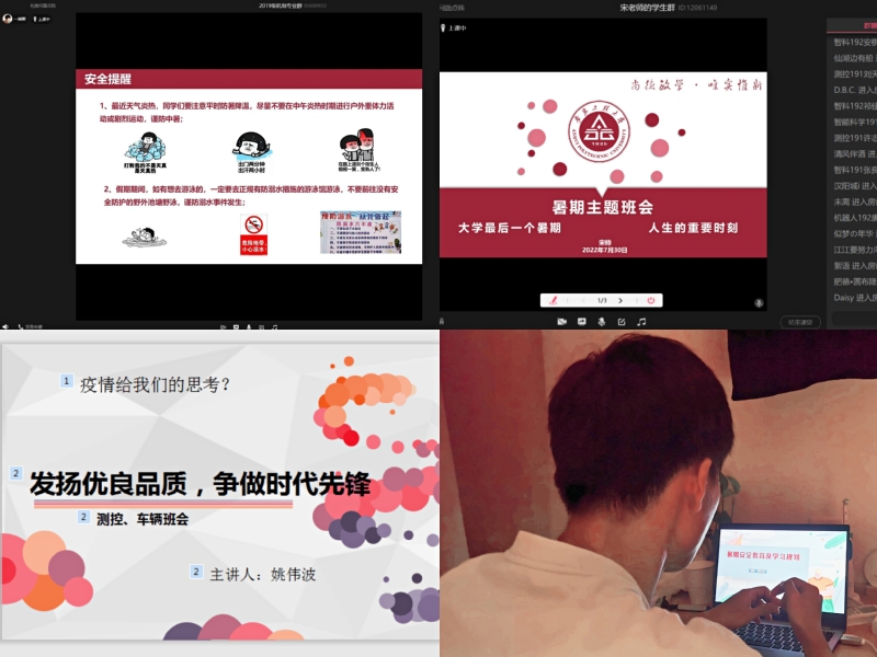 暑假期间,为持续推进学生教育管理各项工作,确保暑期思政育人“不掉线”、青年学子成长“不断线”,机械工程学院(欧美av )全体辅导员重点围绕常态化疫情防控和安全教育,结合假日思政、学风建设、感恩教育、劳动教育、社会实践与职业规划等内容,积极开展暑期线上主题班会。