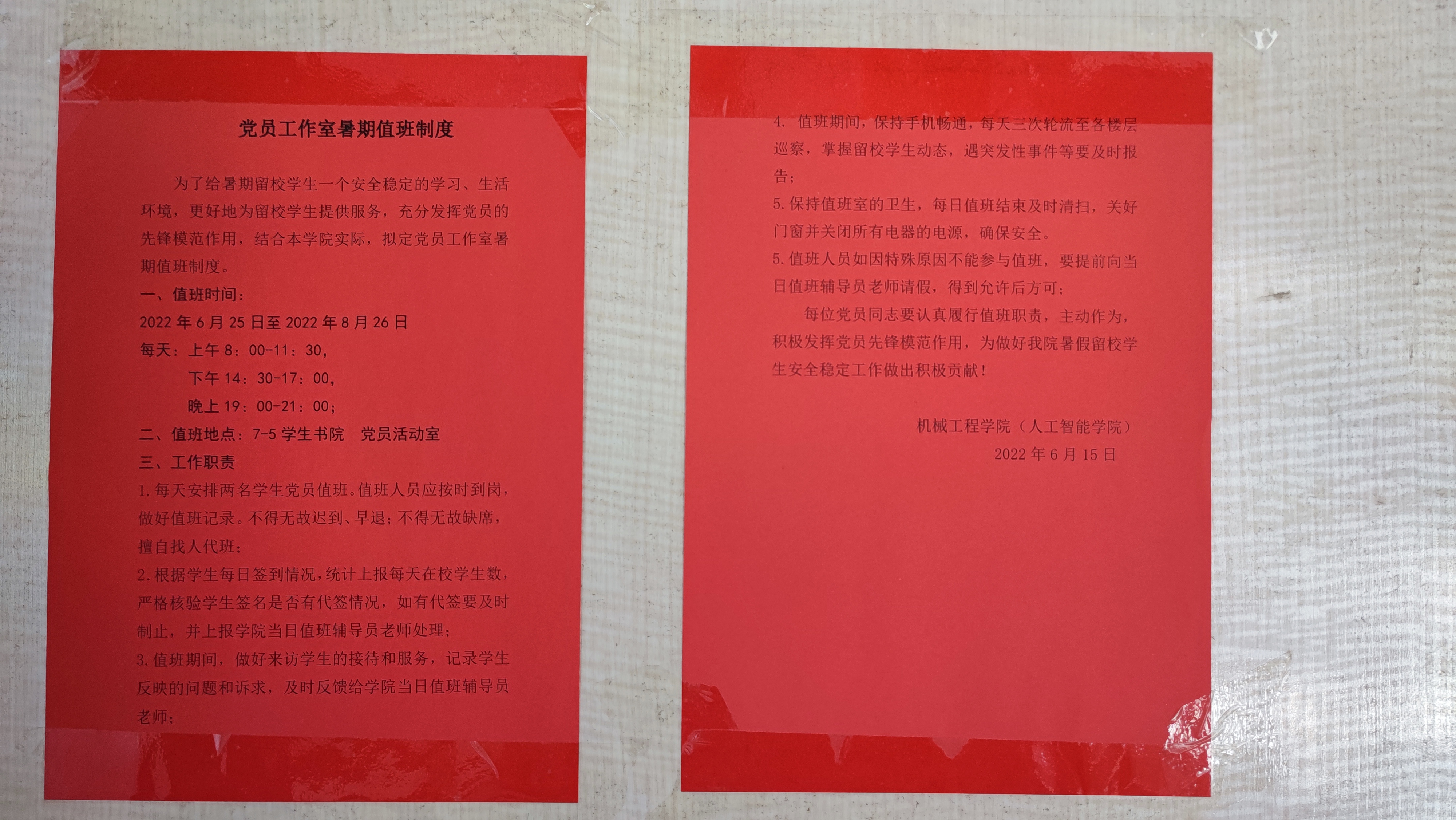 为给暑期留校学生营造安全稳定的学习、生活环境,提供贴心、周到的服务,机械工程学院(欧美av )结合学院实际,制定党员工作室暑期值班制度,充分发挥学生党员先锋模范作用,鼓励、组织学生党员积极参与暑期值班工作,为暑期在校师生提供帮助。
