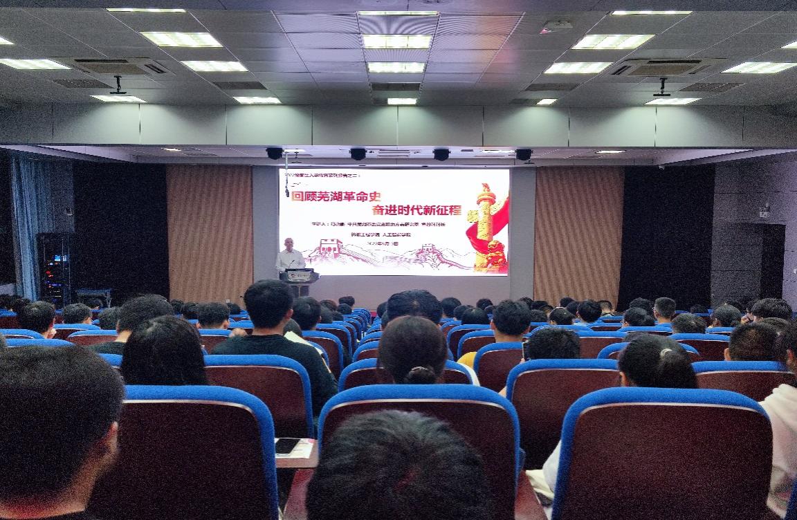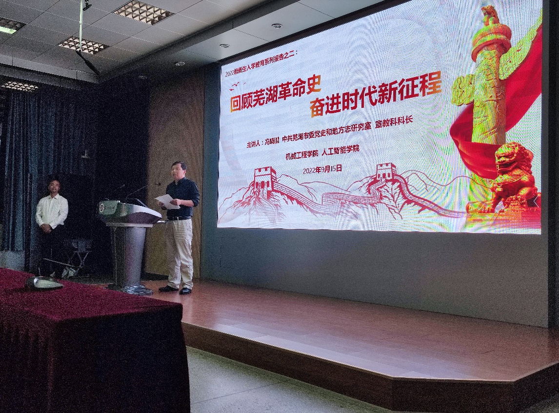学习党史是我们汲取奋进力量的源泉,是引导新时代大学生传承红色基因的重要途径。9月15日,冯晓鹏以“回顾芜湖革命史 奋进时代新征程”为题,带领新生在芜湖地方党史中追随红色记忆、寻找红色足迹。报告从“五四运动和中国共产党”开始讲起,充分利用芜湖文化中的红色资源,讲述了党领导芜湖人民接续奋斗、矢志报国的赤诚情怀,引导新生进一步读懂党史、读懂中国、读懂芜湖地方文化。