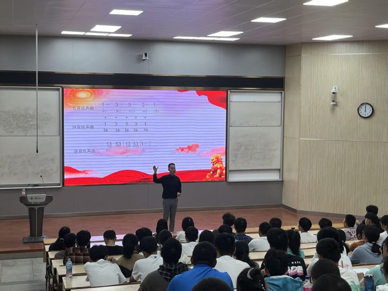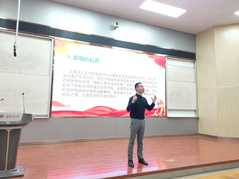 讲座从歌唱的起源与发展展开讲解,结合声乐演唱的方式方法,与同学们进行互动和交流。大家共同鉴赏了民族歌曲《八月桂花遍地开》《凤阳花鼓》;流淌着山水灵气的芜湖市市歌《半城山半城水》是一首古典风味的民族通俗歌曲,曲调优美,歌词写实,反映了芜湖这座城市独特的人文风貌。当优美的旋律响起,同学们完全沉浸在歌曲的意境中、感受到芜湖这座徽派文化特征特别浓郁的江南城市特有的魅力。《义勇军进行曲》诞生于中华民族生死存亡的关头,当中华人民共和国国歌雄壮、激昂的旋律响起,全场肃穆,同学们的爱国激情从心中油然而生。杨顺给大家介绍了《义勇军进行曲》的创作背景,这是一首表现中华民族的刚强性格,显示祖国尊严、充满同仇敌忾、团结御敌豪迈气概的革命战歌,对激励中国人民的爱国主义精神起了巨大的作用。