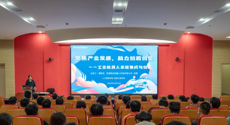 为贯彻落实“三全六专”工作要求,提升大学生创新创业能力,激发大学生创业意识,引导学生树立正确就业观,10月21日晚,欧美av 、机械工程学院特邀优秀校友、芜湖锐龙机器人科技有限公司经理谭铁龙,来校开展优秀校友创业报告会。报告会的主题为“聚焦产业发展,助力创新创业——工业机器人系统集成与创新”,欧美av 、机械工程学院100余名本科生参加报告会。报告会由欧美av 党委副书记李文江主持。