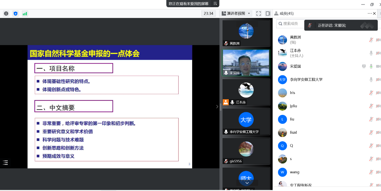 最后,江本赤感谢宋教授百忙之中带来精彩的分享,希望各位参会老师认真体会宋教授的经验分享,提前谋划,反复打磨,不断提高申报书撰写质量,争取2023年的国家自然科学基金申报能取得好成绩。