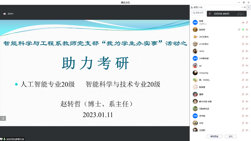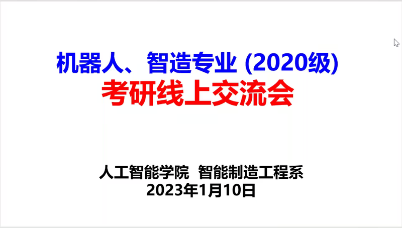 为深入贯彻落实“三全六专”工作要求,进一步帮助2020级有意向考研的学生有效解决考研院校选择、专业选择等问题,1月10、11日晚19:00,智能制造工程系、智能科学与工程系分别开展考研线上考研交流会。学院党委副书记李文江、副院长刘玉飞、各系部专业教师、辅导员、20级全体学生参与线上交流会,辅导员张璐主持会议。