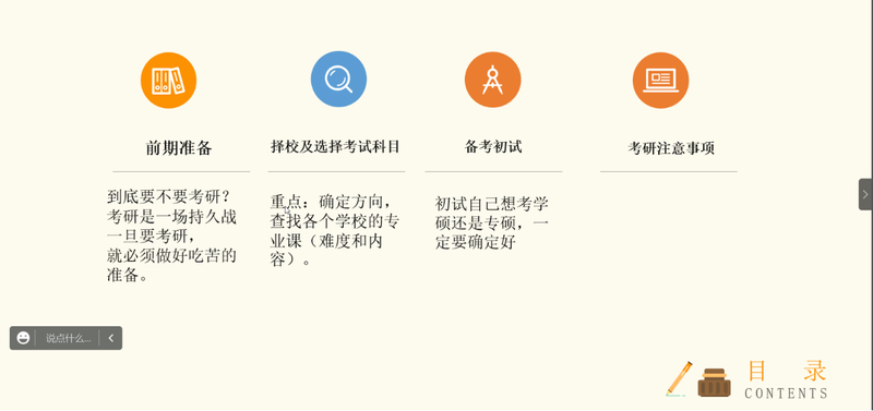机器人192李恒同学从考研前期准备、择校及选择考试科目、备考初试、考研注意事项四方面进行交流,结合自身备考经历,详细介绍高数、英语、政治以及专业课复习要点。