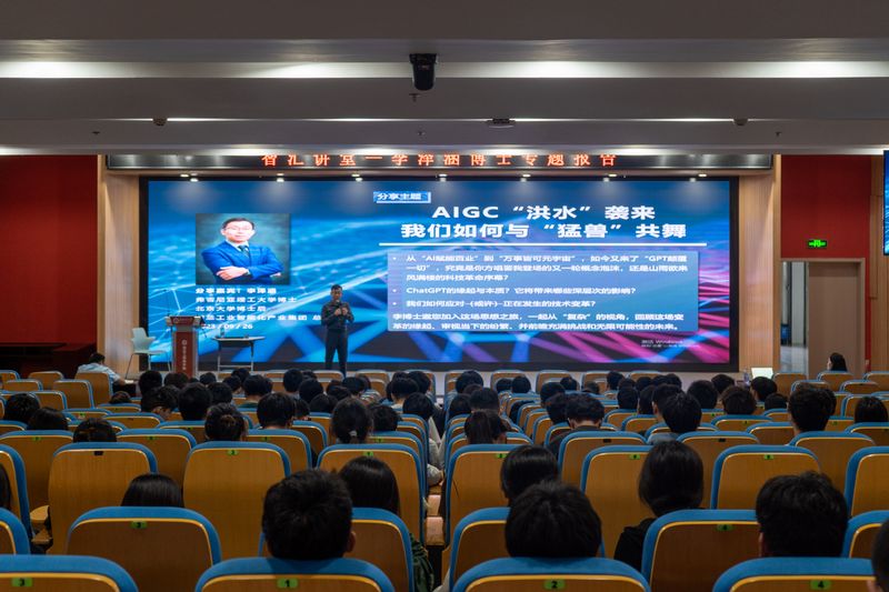 与会人员围绕人才培养、校企合作、学科竞赛、学生就业和教师工程能力提升等内容进行了深入交流。李泽涵博士为学院师生作了题为《AIGC“洪水袭来,我们如何与“猛兽共舞》专题报告。介绍了ChatGPT、AIGC与新-轮AI技术爆发,AI技术变革对生产组织方式、就业结构、职业发展的影响,个体及企业应对AI技术变革的策略等,给全体师生上了一堂生动的AI前沿技术课,整个报告持续近2个小时,师生反映强烈,意犹未尽。