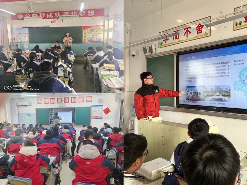 智科232许翔团队深入芜湖泰文中学、智科231梁业伟团队深入六安市毛坦厂中学东校、人工智能232褚能超团队在巢湖市第一中学、机器人232杭京团队在定远县第三中学、智科231杨奕团队在宿州市泗县第二中学向高中学弟学妹们详细讲解学校的专业情况、办学特色和环境条件,并结合自己的大学生活,祝福大家逐梦启航,梦想成真。机器人231陶润祥团队到枞阳县宏实中学、颍上第一中学等,智造232陈浩伟团队到六安一中东校区,智造231范欣悦团队在泗县第三中学,智造232张佳佳团队在高河中学,分发了宣传册并展示了宣传海报,播放了学校招生宣传的视频,讲解了招生PPT,同时结合自己大学的生活感悟为同学们讲述了大学的欢乐、充实生活,解答一些同学对大学的疑惑。各团队认真准备宣传视频及材料,热情推介学校,取得了较好的宣传效果。