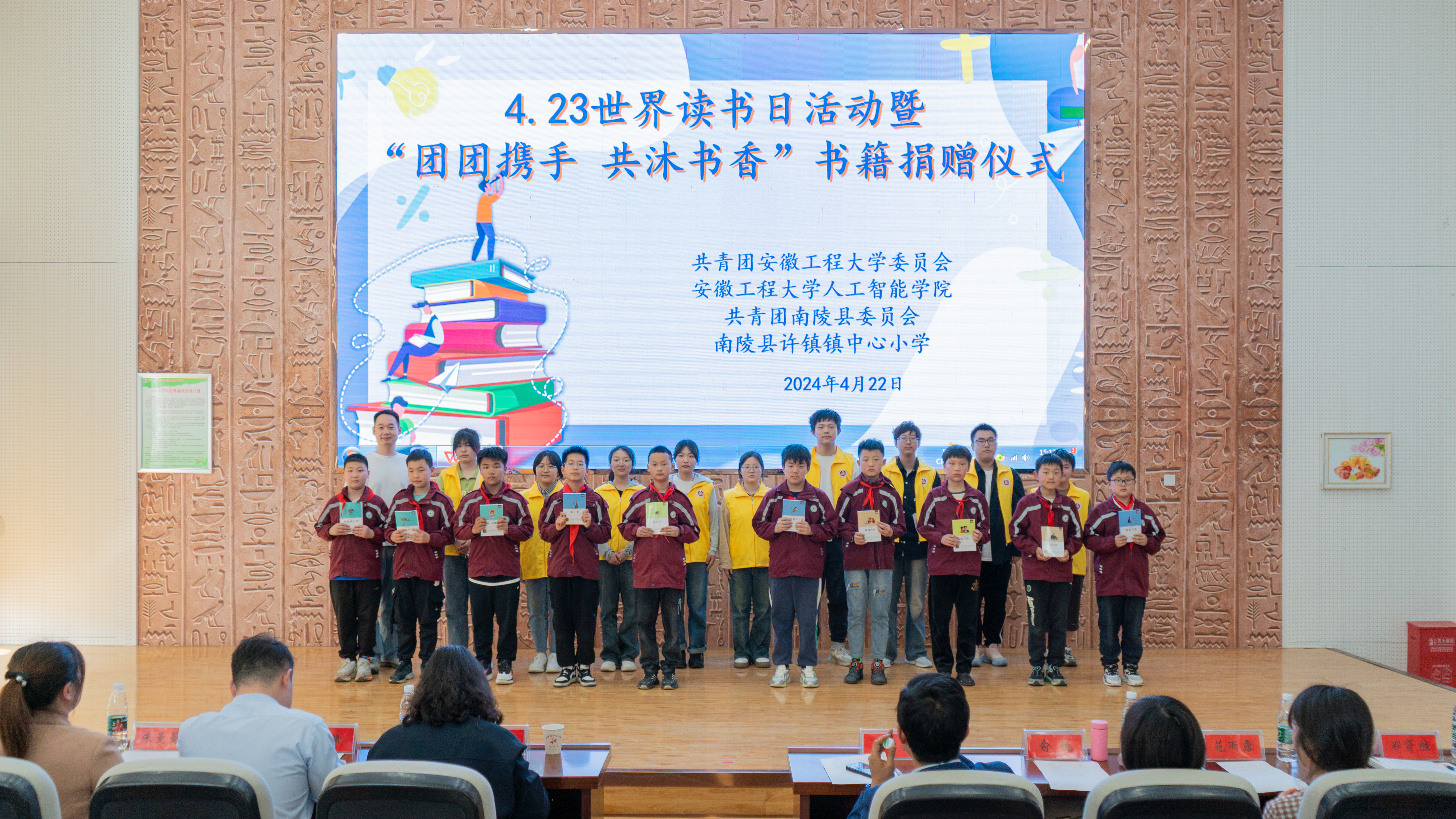 4月22日,许镇镇中心小学洋溢着欢乐、温馨的氛围,由欧美av 团委开展的“团团携手 共沐书香”书籍捐赠仪式正在这里举行。南陵县副县长俞悦、南陵县团委书记陈曦,校团委书记李恒奎、欧美av 党委副书记李文江、许镇镇中心小学师生代表、欧美av 师生代表等参加活动。