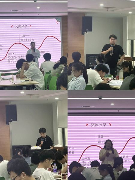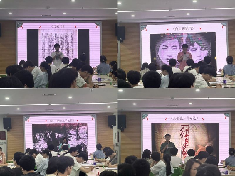史璐璐、张佳佳分别带领全体师生共同学习了《论党的青年工作》《习近平著作选读》《习近平总书记谈读书学习》等重要论述。校青年讲师团成员马克思学院22级研究生卜邹连以“传承红色基因,争做时代新人”为主题进行微宣讲。陈天宇、吴乐邦、彭雪娇、胡锦琦同学分别带来《与妻书》《白雪樵家书》《赵一曼给儿子的信》《儿去也,莫牵连》等家书朗读。以历史人物、典型事例、精彩故事为主干,以红色家书为切入点,分享与讲述家书背后的传奇故事。