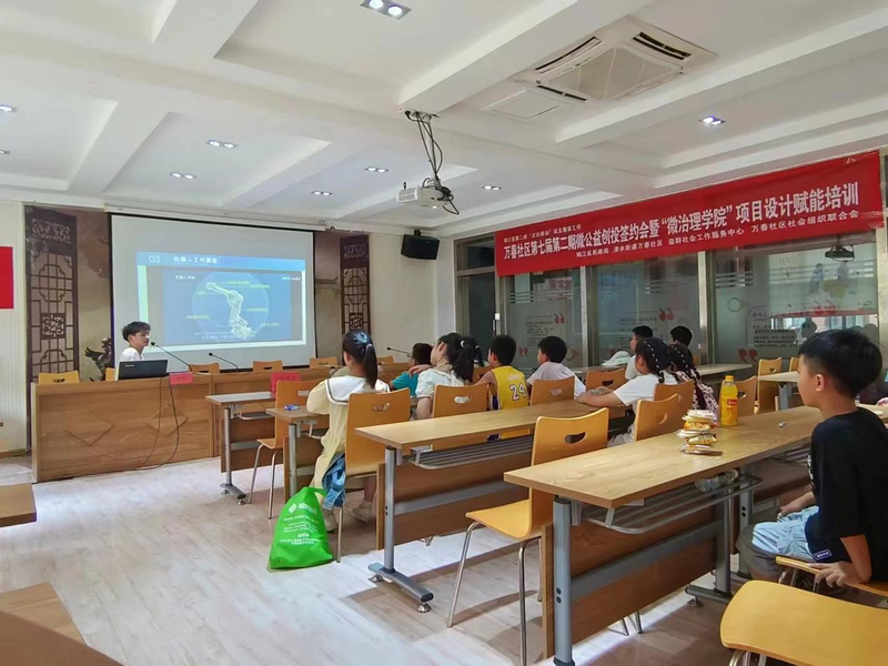 团队成员刘杨通过科普讲座演示了“什么是机器人”,“机器人的结构和原理”,“工业机器人”以及通过播放“趣味机器人的制作过程”完成制作教学,让社区小朋友对机器人有了更加具象化的了解,对机器人的运行原理有了初步的认知。在机器人科普讲座过程中,采取有奖问答的方式调动社区小朋友的积极性,带领他们了解最新的机器人知识。