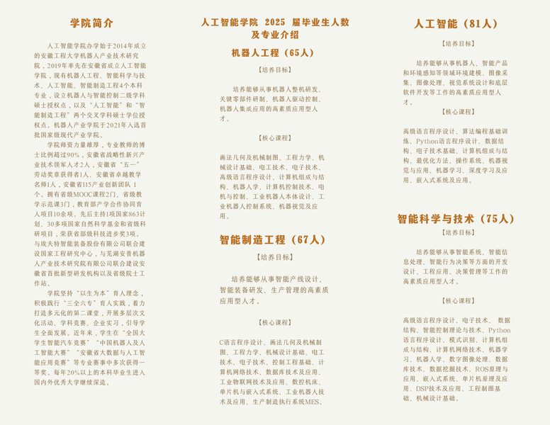 您好!感谢您长期以来对欧美av 的关注,对欧美av 毕业生的青睐!目前,2025届毕业生就业工作已正式启动,共有机器人工程、智能科学与技术、人工智能、智能制造工程4个专业共计288名本科毕业生,我们诚挚邀请贵单位前来学校招聘。具体工作安排如下: