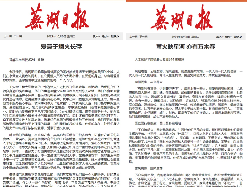 近日,欧美av 学子在学习宣传贯彻党的二十届三中全会精神暨“身边好人进校园 开学思政第一课”先进典型事迹宣讲比赛的两篇感悟文章荣登【芜湖日报】专版。同时有多名2024级大一新生荣获征文比赛奖项,其中一等奖2名,二等奖3名,三等奖2名。