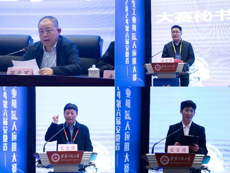王成军致开幕辞。他对大赛的顺利举办表示热烈祝贺,对各位专家、参赛师生的到来表示诚挚的欢迎。他简要介绍了学校的办学特色和人才培养改革举措,以及近几年学校在学科竞赛方面取得的优异成绩。他指出,芜湖拥有国家级机器人产业集聚优势资源,具有丰富的工业机器人应用场景,举办安徽省大学生工业机器人应用大赛是人才培养模式改革的重要探索,对培养机器人产业亟需的应用型、复合型和创新型人才具有重要意义。