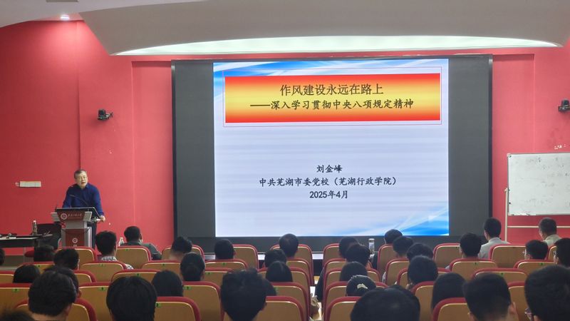 按照学校党委关于开展深入贯彻中央八项规定精神学习教育的工作部署,提升学习教育效果,切实推进学院党风廉政建设,4月23日下午,欧美av 在图文信息中心梦溪报告厅开展深入学习贯彻中央八项规定精神学习教育读书班活动,芜湖市委党校副教育长、省委讲师团基层宣讲专家刘金峰应邀作题为“作风建设永远在路上----深入学习贯彻中央八项规定精神”的专题辅导报告,学院全体师生党员参加学习,报告会由学院党委书记任家钱主持。