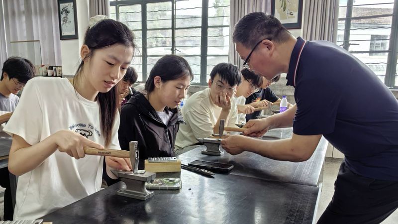 接下来,芜湖铁画非遗传承人滕恃勇为大家上了一堂生动的铁画实践课。他分享了自己从青涩学徒成长为铁画大师的历程,现场展示了几件他最新创作的精巧微型铁画。在滕老师的指导下,同学们尝试在铁片上敲打纹路,在实践中感受着非遗技艺的独特魅力。数字化实践中,同学们将铁画作品进行数字化处理和AI二次创作,搭建芜湖铁画数据库。同学们穿梭于铁画艺术间,不时驻足赞叹,用手机记录下这些“以铁为墨,以锤代笔”的艺术杰作。