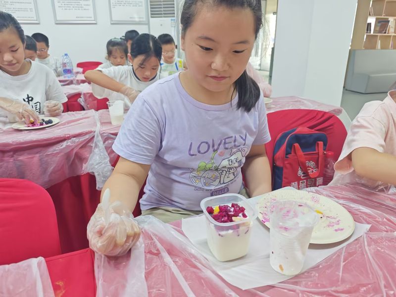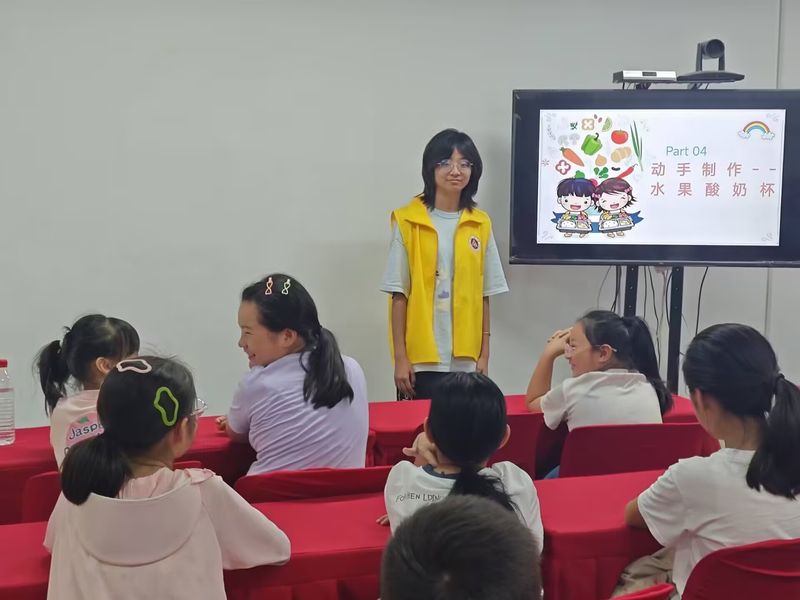 活动聚焦“舌尖上的科学”,带领孩子们制作手工酸奶。队员们先讲解牛奶变酸奶的原理:“牛奶里加入乳酸菌,在合适的温度下发酵,就会变成稠稠的酸奶啦。”接着分发消毒过的容器、纯牛奶和发酵剂,指导孩子们按比例混合、密封,再放进温水环境中等待发酵。等待期间,队员们用动画短片科普“微生物与发酵”的小知识。孩子们根据喜好加入蜂蜜或水果粒时,都兴奋地品尝起来。“自己做的酸奶更甜!”不仅让孩子们尝到美味,更直观理解了科学在生活中的应用。