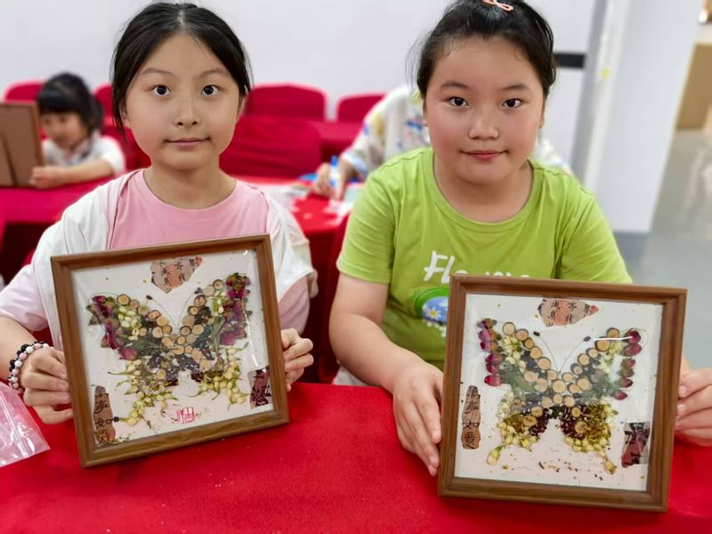 活动以“中药画创作”为主题,将中医药文化与艺术创作相结合。实践队员先通过图片和实物展示,向孩子们介绍每种药材的名称、形态及简单功效,并示范如何利用药材的天然颜色和形状拼贴成画——用艾叶铺成草地,金银花点缀成星星,陈皮剪成小船……孩子们发挥想象,在卡纸上组合药材,有的拼出“乡村小屋”,有的贴成“花草动物”,在动手过程中认识中药、感受自然之美,也悄然种下对传统医药文化的好奇。