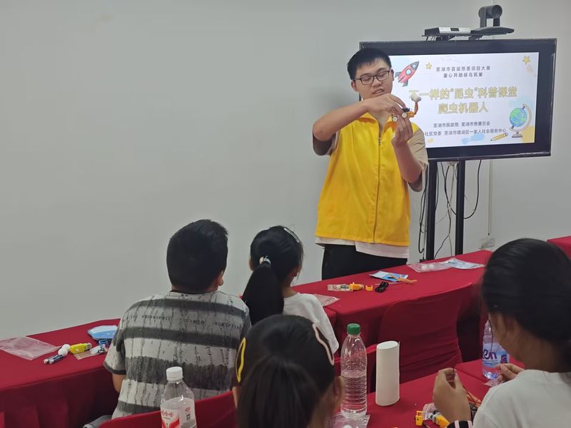 此次活动充满科技感——组装“机器爬虫”。队员们准备了齿轮、电机、电池盒、塑料外壳等材料,先通过视频展示爬虫的运动原理:“电机转动带动齿轮,让爬虫的‘腿’前后摆动,就能像虫子一样爬行了。”随后分组教学,孩子们在指导下连接电路、固定零件,一步步将零散的材料拼成完整的爬虫。当打开开关,看着自己组装的爬虫在地上“爬”起来时,现场一片欢呼。有孩子还创意改造,给爬虫贴上彩纸“外衣”,让科技小制作更添趣味,也激发了对机械与工程的探索欲。