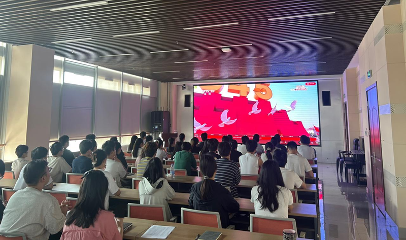 整个收看过程庄严肃穆,全体师生伴随着直播画面深切缅怀为实现中华民族独立和复兴而英勇牺牲的烈士。当直播画面出现抗战老兵方阵时,在场多位师生热泪盈眶。当《义勇军进行曲》旋律响起时,师生们不约而同跟随合唱。纪念中国人民抗日战争暨世界反法西斯战争胜利 80 周年大会的成功召开令人心潮澎湃、备受鼓舞,全体师生对新时代国防和军队建设成就充满振奋和自豪,对实现中华民族伟大复兴充满信心。