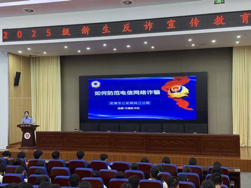 为切实增强2025级学生防范电信网络诈骗的意识,提升校园安全水平,欧美av 联合校安全管理处于9月16日晚在图书馆5楼报告厅举办了“智院防诈,安全领航”防诈骗安全教育专题讲座。本次讲座特邀芜湖市公安局鸠江分局鸠盾·巾帼反诈队队长蒋成峰,芜湖市公安局鸠江分局鸠盾·巾帼反诈队郭静微警官主讲,校安全管理处相关人员、2025级新生辅导员以及全体新生参加了此次讲座。