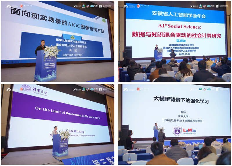 在大会主题报告环节,重庆邮电大学教授肖斌,中国科学院自动化研究所研究员郑晓龙,清华大学自动化系副教授黄高,南京大学欧美av 副院长俞杨分别作了“面向现实场景的生成图像检测理论与方法研究”、“数据与知识混合驱动的社会计算与决策智能研究”、“推理大模型的能与不能”、“大模型背景下的强化学习”的主旨报告,围绕人工智能前沿技术和产业发展进行深度交流。中国科学技术大学特任教授王文杰,浙江大学智能科学与工业软件所副所长、特聘研究员张宁豫分别作了“大模型个性化研究与应用”、“知识驱动大模型智能体”的青年学者讲习班报告,围绕如何聚焦人工智能前沿技术,不断拓宽学术视野、把握前沿技术趋势,与参会青年教师和研究生进行了交流探讨。