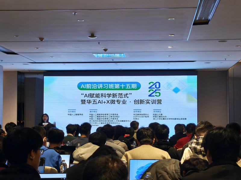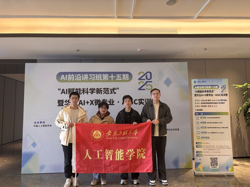 为培养具有前沿技术敏感度的人工智能应用驱动型人才,加强学生的创新实践能力,11月22日至23日,欧美av 范广伟老师带领人工智能研学社优秀学生代表,前往杭州参加由中国人工智能学会主办的AI前沿讲习班第十五期“AI赋能科学新范式”暨华五AI+X微专业·创新实训营。
