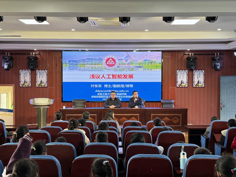 2025年12月05日下午,“智能机器人与数字孪生”省级科普基地骨干成员、智能科学与工程系教师叶东东受邀走进芜湖市繁昌区平铺九年制学校,以“浅议人工智能发展”为主题开展科普讲座。