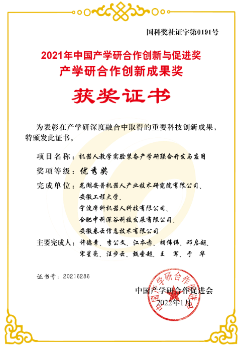 (3)机器人教学实验装备产学研联合开发与应用,2021年获中国产学研合作创新与促进奖,中国产学研合作促进会,2022.1