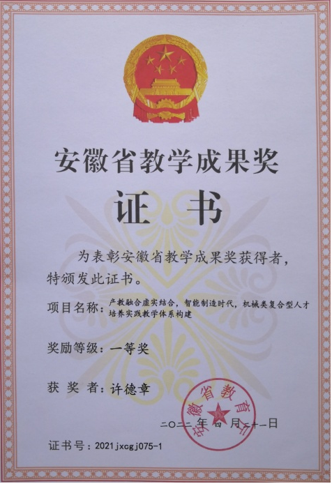 (1)产教融合虚实结合,智能制造时代,机械类复合型人才培养实践教学体系构建,安徽省教学成果一等奖,2022.4.21